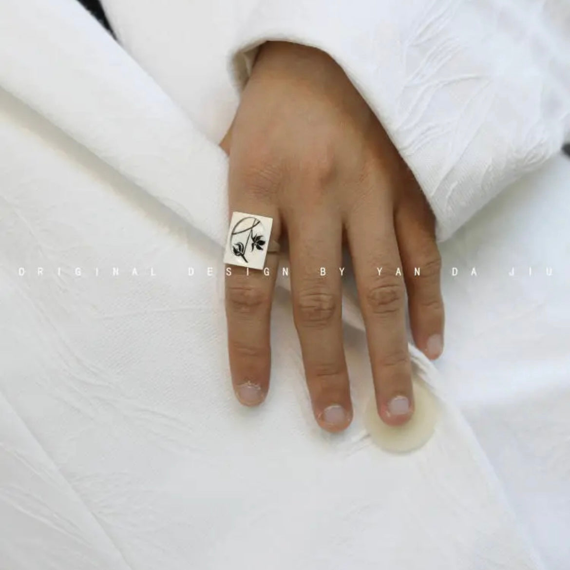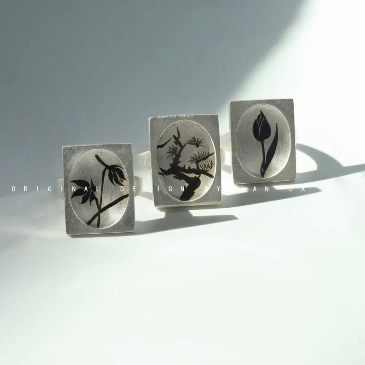This unique ring by Dajiu features a sterling silver base adorned with hand-painted lacquer artwork, depicting delicate tulips, orchids, or pine leaves. Each design reflects a subtle elegance inspired by nature and traditional craftsmanship.